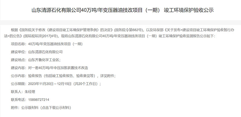 山東清源石化有限公司40萬噸/年變壓器油技改項目(一期) 竣工環境保護驗收公示